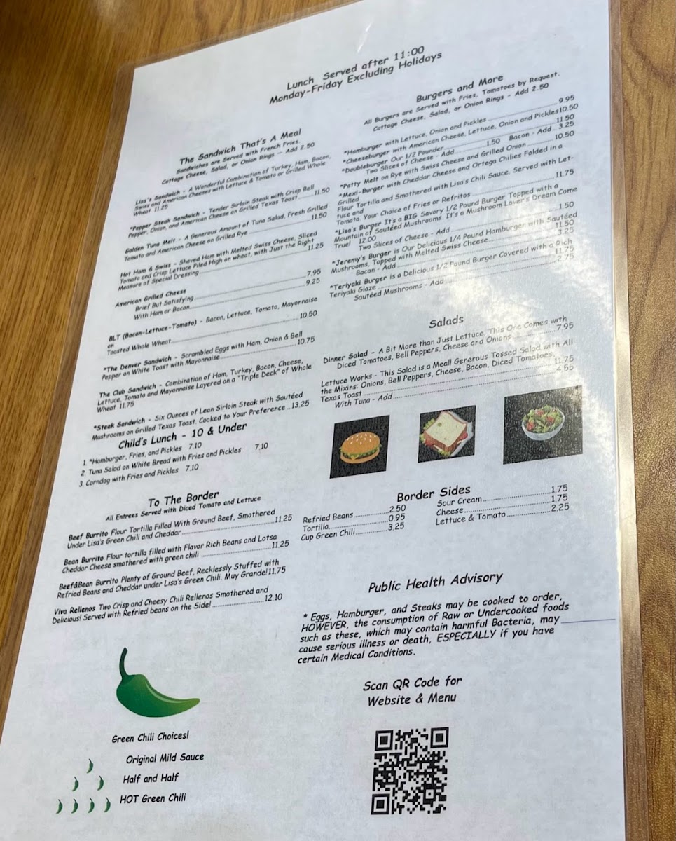 With cheddar cheese and ortega chilies folded in a grilled flour tortilla and smothered with lisa's chili sauce. Served with lettuce and tomato. Your choice of fries or refritos